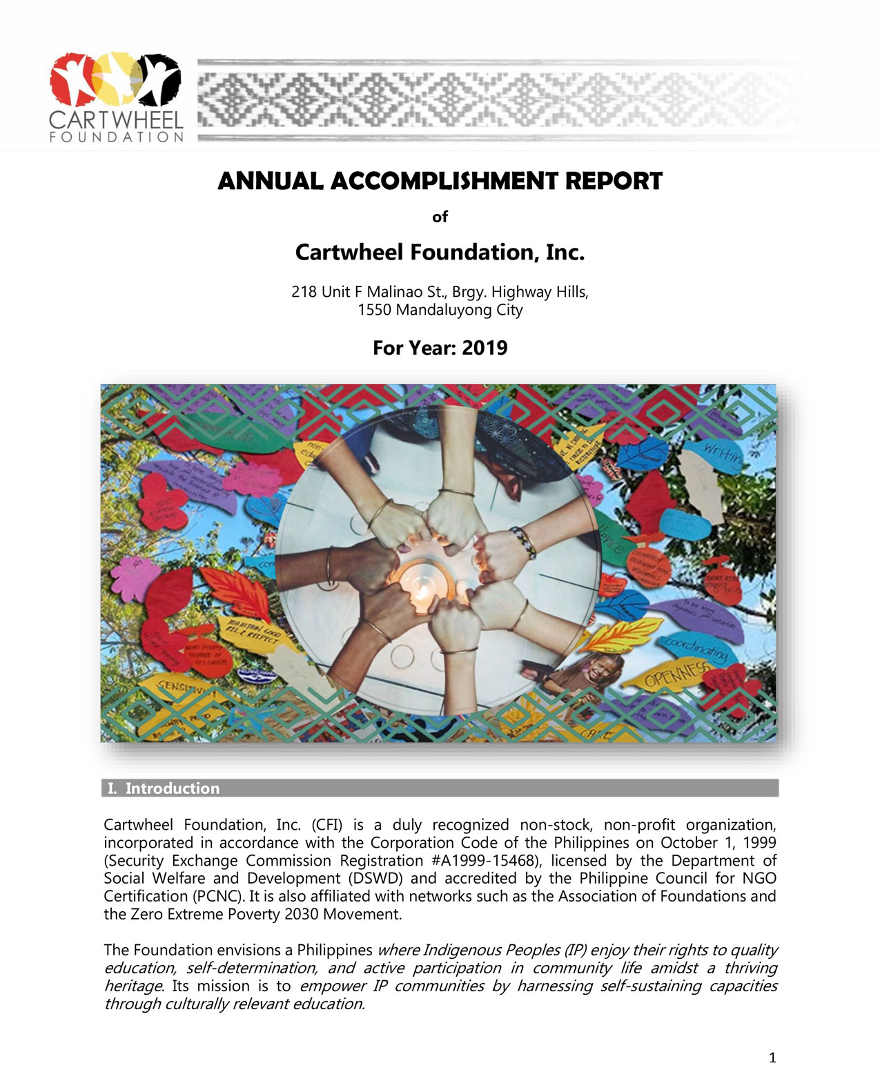 Cartwheel Foundation, Inc. (CFI) is a duly recognized non-stock, non-profit organization that seeks to nurture Filipino indigenous heritage through culturally relevant education.